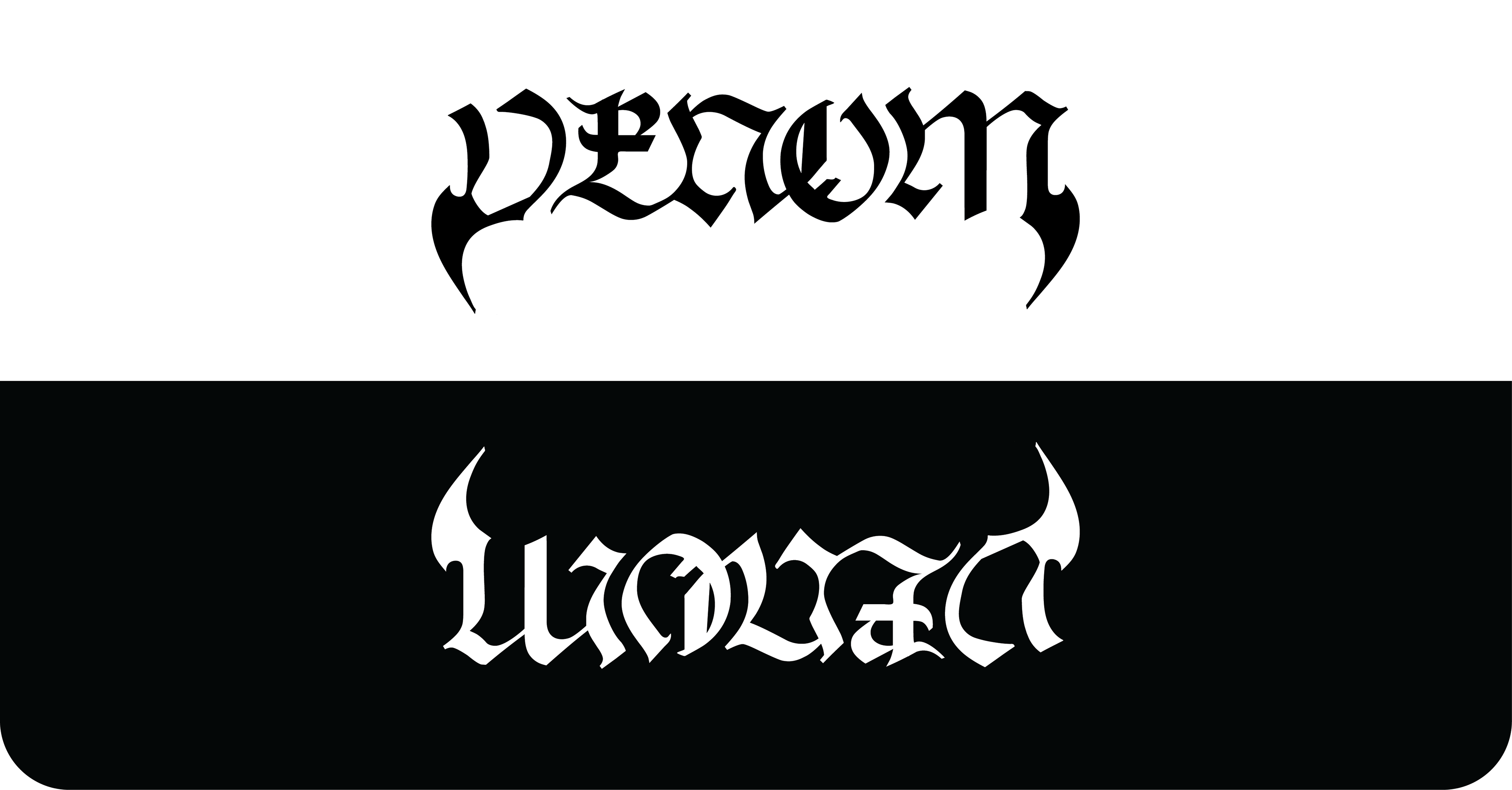 The blackletter typography piece titled Venom is an ambigram that reads "Woman" when read upside down.